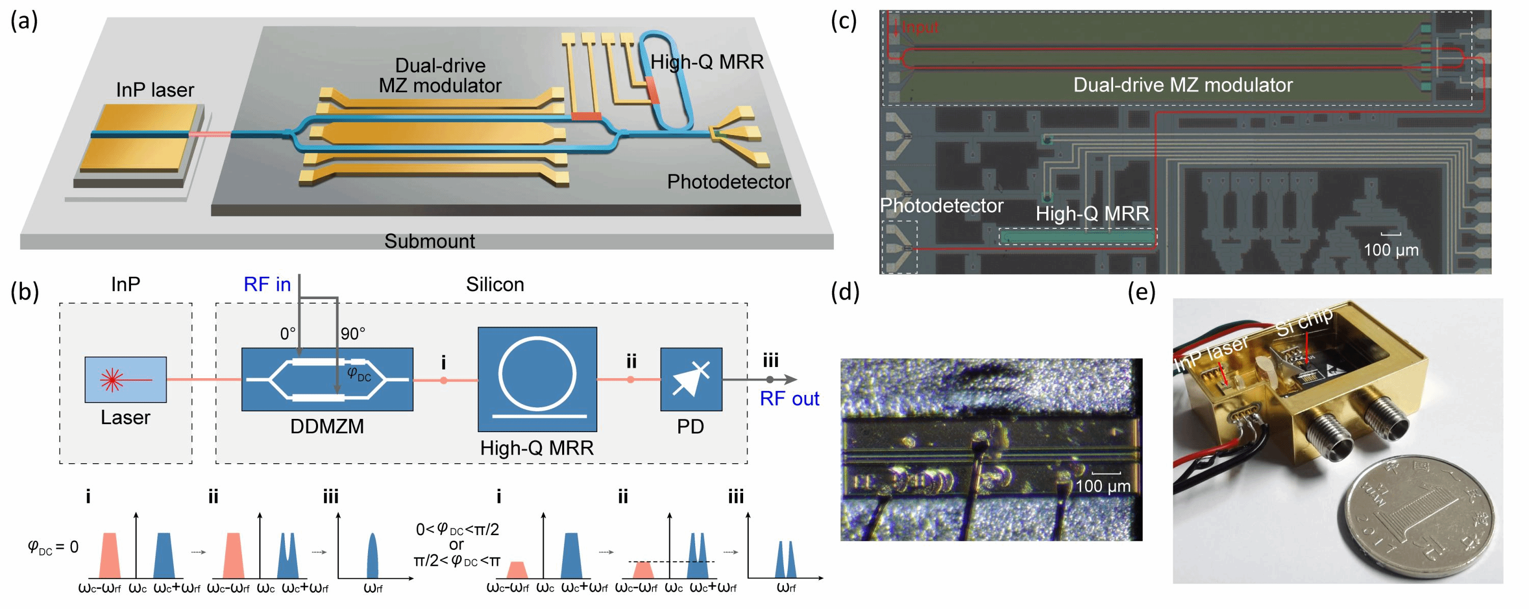 中心博士生陶源盛、博士后舒浩文等最新关于硅基混合集成微波光子滤波器的文章 “Hybrid integrated high-performance microwave photonic filter with switchable response” 近期发表在Photonics Research期刊上。在这项研究中,本课题组研究人员将铟磷(InP)基分布反馈式半导体激光器芯片与单片集成了双驱Mach-Zehnder调制器、高Q值微环与锗硅探测器的硅基有源芯片,利用微光学方法进行混合集成封装,成功研制出全集成的微波光子滤波器(图1)。