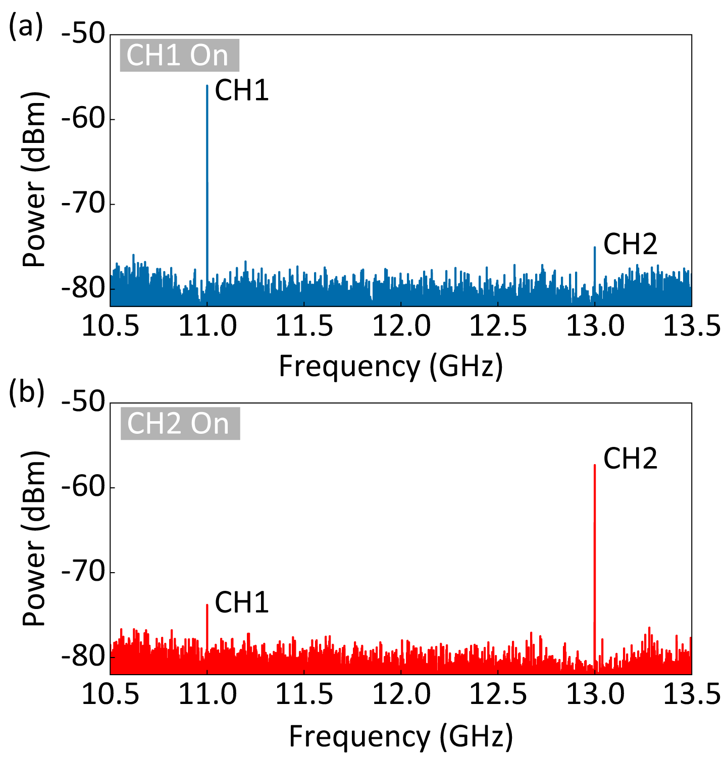 该微波光子滤波器在实现高集成度的同时,展现出了优异的滤波性能:3-25 GHz宽频率调谐范围、360 MHz窄滤波线宽和>40 dB高带外抑制比。此外,滤波响应可以在带通滤波与带阻滤波两种工作模式间灵活快速切换,切换响应时间仅48微秒。利用该器件,研究人员还成功对干扰抑制、信道选择两类不同应用场景中的微波信号滤波效果进行了验证(图2)。