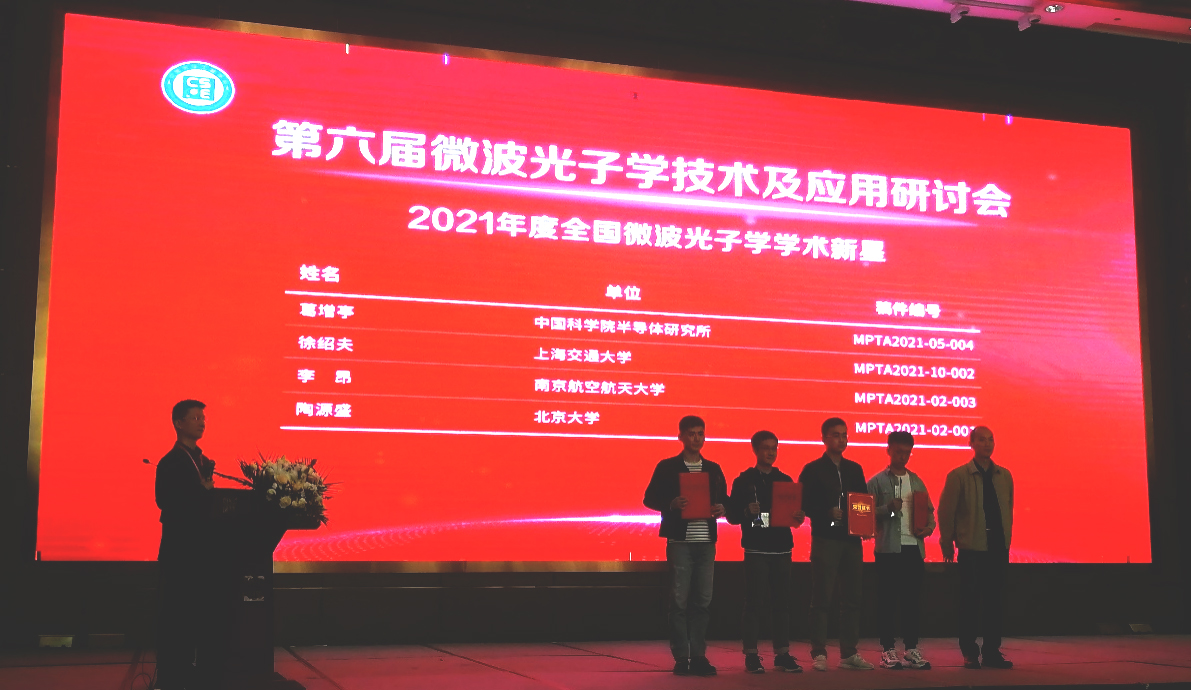 2021年10月13日至10月15日,“第六届微波光子学技术及应用研讨会”在西安举行。在此次会议中,为对科研能力优异者给予表彰鼓励,并激发青年学者的科研热情,大会程序委员会委员共评选出四位优秀报告人,授予“中国微波光子学学术新星”奖项。我中心博士生陶源盛喜获该奖项。电子科技大学张伟利教授作为嘉宾为获奖个人颁奖。