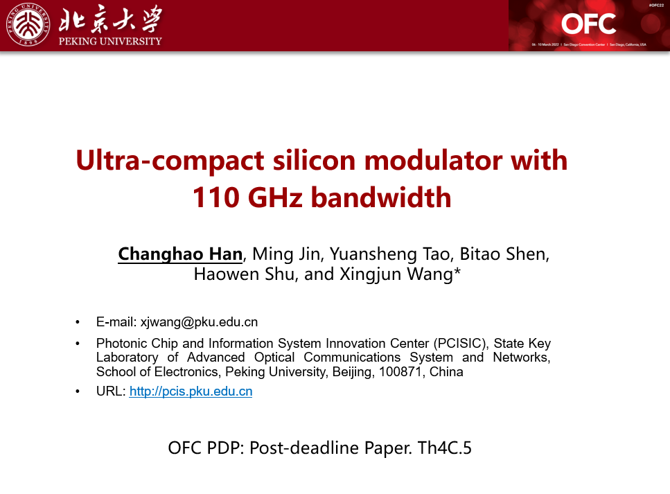 该项成果以《超小尺寸110GHz带宽硅调制器》“Ultra-compact silicon modulator with 110 GHz bandwidth”为题,于2022年3月在美国圣地亚哥举办的OFC会议(Optical Fiber Communication Conference)中作为PDP(Post-deadline paper,在截稿日期之后被接收的论文)论文发表。中心博士研究生韩昌灏为论文第一作者,王兴军教授为通讯作者,中心博士研究生金明、陶源盛、沈碧涛、博新计划博士后舒浩文等参与了相关研究工作,同时感谢国重实验室李艳萍副教授、凌云公司在高频测试方面的帮助。OFC会议是光通信领域中全球规模和影响力最大的顶级国际会议,PDP论文旨在发布光通信领域的最新技术进展和纪录性成果,代表着业内当前最高技术水平。在四十多年的会议历史上,共发表PDP论文千余篇,中国大陆研究机构作为第一单位仅发表十余篇,本届OFC PDP论文全球仅24篇。