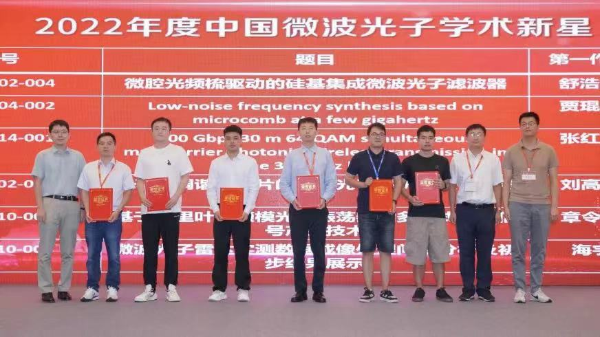 近日,“第七届微波光子学技术及应用研讨会”在桂林举行。此次会议举行了“2022年中国微波光子学学术新星”评选活动,邀请35岁以下青年学者以快报告的形式对1-3项原创性成果进行展示,由大会程序委员会评选出六位优秀报告人,授予“中国微波光子学学术新星”奖项。我中心博士后舒浩文喜获该奖项。北京大学解晓鹏教授作为嘉宾为获奖个人颁奖。
