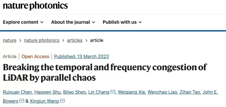 团队研究成果 “Breaking the temporal and frequency congestion of LiDAR by parallel chaos” 发表在2023年3月13日的《自然-光子学》(Nature Photonics)杂志。