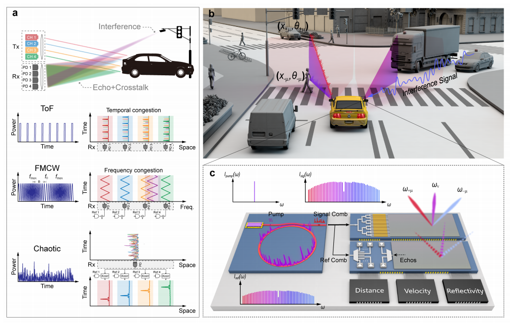 随着高级别自动驾驶的日益普及,确保行驶舒适安全的激光雷达作为其核心器件,受到越来越多的重视。高性能、小体积、低成本、低功耗、高安全的激光雷达是未来厂商竞相追逐的方向。北京大学电子学院王兴军教授课题组-常林研究员课题组在两年攻关的基础上,研制出一种全新的硅基片上多通道混沌光源,提出了一种基于混沌光梳的并行激光雷达架构,攻克了激光雷达抗干扰和高精度并行探测这两个世界性难题,保证高性能高安全的同时,极大降低未来激光雷达系统体积、复杂度、功耗和成本。
