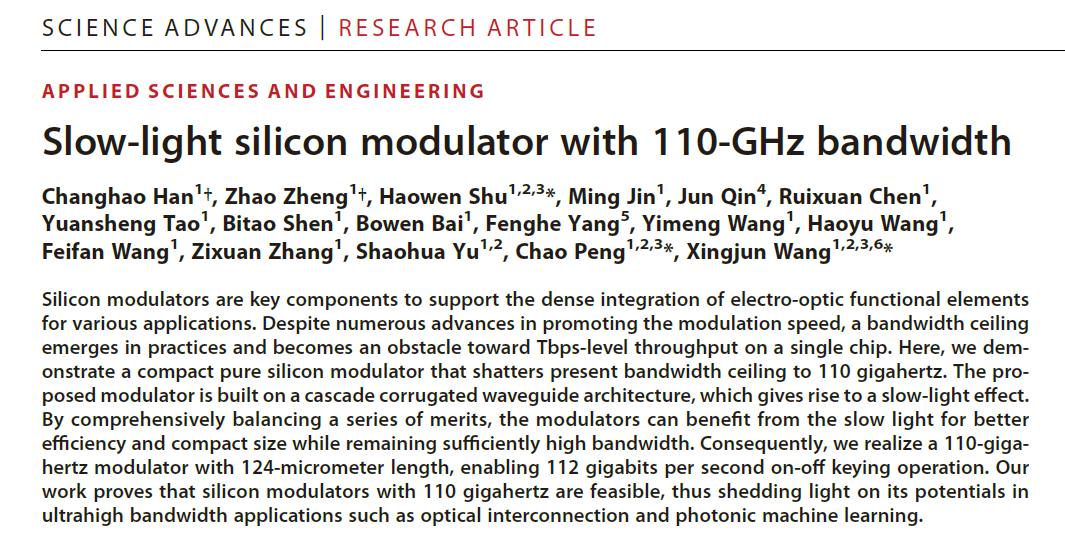 近期,中心王兴军教授、舒浩文研究员联合电子学院彭超教授团队在超高速纯硅调制器方面取得创记录突破,实现了全球首个电光带宽达110GHz的纯硅调制器,是2004年Intel在Nature期刊报道第一个1GHz硅调制器后,国际上第一次把纯硅调制器的带宽提高到100GHz以上。该纯硅调制器同时具有超高带宽、超小尺寸、超大通带及CMOS工艺兼容等优势,满足了未来超高速应用场景对超高速率、高集成度、多波长通信、高热稳定性及晶圆级生产的需求,是硅基光电子领域的重要突破,为高速、短距离数据中心和光通信的应用提供了关键技术支撑,对于下一代通信技术的发展具有重要意义。10月20日,相关研究成果以《110GHz带宽慢光硅调制器》(“Slow-light silicon modulator with 110-GHz bandwidth”)为题,在线发表于Science子刊《科学·进展》(Science Advances)。