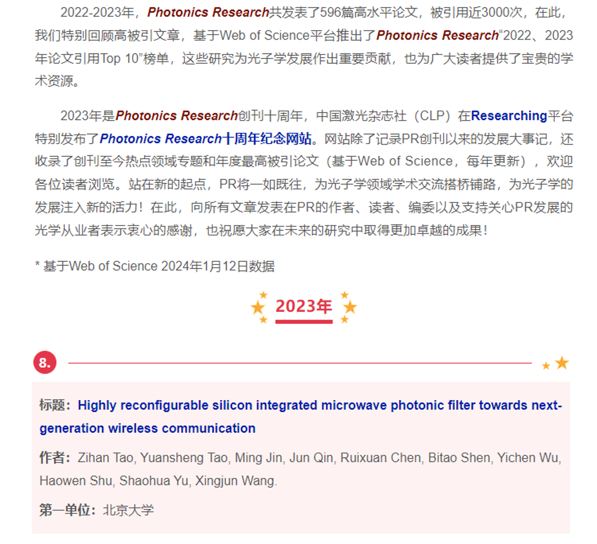 基于Web of Science 2024年1月12日数据,中心在《Photonics Research》上发表的工作“Highly reconfigurable silicon integrated microwave photonic filter towards next- generation wireless communication”成功入选2023年度论文引用“TOP” 10名单,中心博士生陶子涵与已毕业博士生陶源盛为该工作的共同第一作者,中心王兴军教授、舒浩文研究员为论文通信作者。