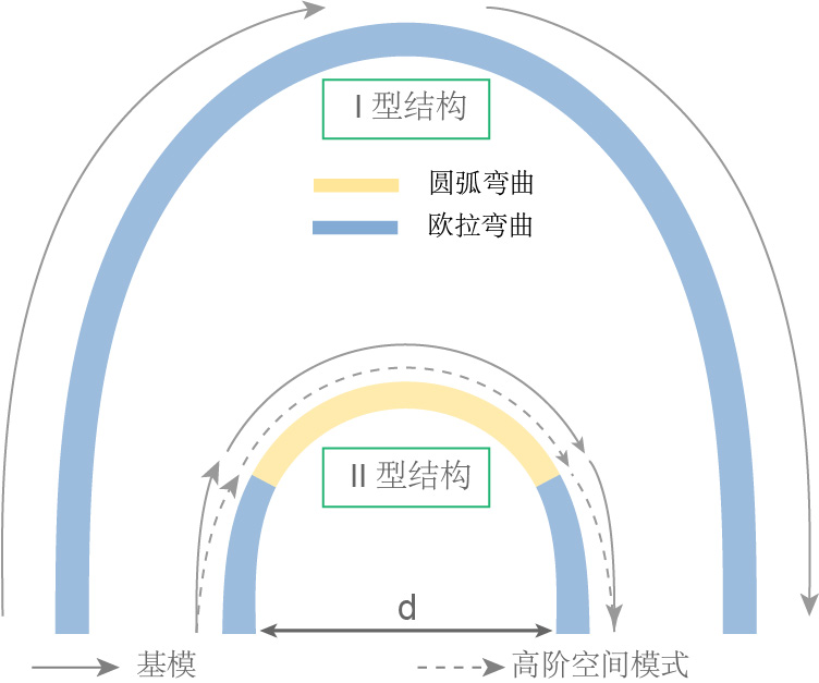 研究团队选用跑道型微环设计集成微腔,在绝缘体上单晶硅薄膜(SOI)平台上进行器件设计,并将硅波导的宽度扩展至2微米,使其能够支持更高阶的空间模式。同时,相比使用大尺寸欧拉弯曲以实现缓变绝热近似的传统方案,研究团队利用欧拉弯曲+圆弧构建对称的180°弯曲波导,并有意大幅缩小弯曲尺寸,以高效地在微腔内诱导高阶空间模式。两种方案的几何结构如图1所示。
