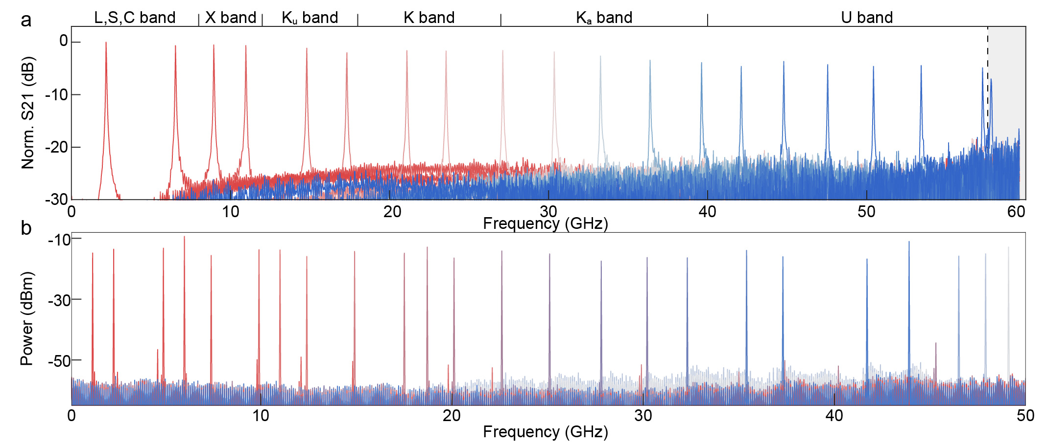 该微环作为微波光子链路中的关键部件,能够在超宽频谱内提供极其精细的滤波功能。基于该微环的微波光子滤波器能够在L, S, C band至U band范围内实现了高达58 GHz的连续调谐能力,其3 dB滤波线宽最窄仅32 MHz(如图5a所示)。由于采用相调转强调(PM-IM)方案,该结果实际只覆盖了一半FSR。未来,结合更高带宽的调制器和探测器,可以实现高达116 GHz范围内的连续、无间断滤波。在此基础上,研究团队借助该微环成功完成了光电振荡器(OEO)的实验验证,实现了中心频率从sub-6G到50 GHz的可调谐微波源(如图5b所示)。这种滤波器和OEO代表了目前国际上基于集成硅基器件所实现的最宽频段和最精细纵模滤波的水平。
