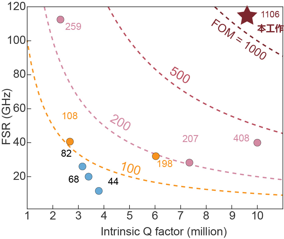 由于微环弯曲波导的尺寸极小,微环在频域上具有极大的FSR,而当光子分子处于关闭状态时,基模又可以实现在环内零串扰、低损耗传输。在此基础上,研究人员实现了基于标准硅光工艺下最大的本征Q和FSR的乘积,大幅优于其他在硅基平台上的工作(如图4所示)。