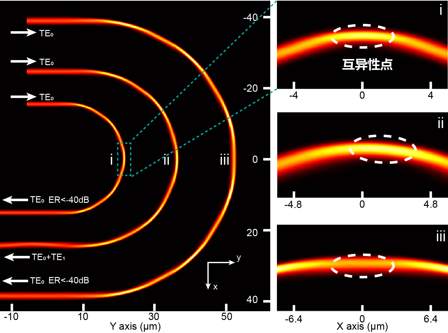 研究人员借鉴旋转波近似法,对经典耦合模方程进行了修正,从而更有效地分析该问题下的耦合规律。此外,研究人员还根据弯曲波导内光场强度的分布,引入“互异性点”的概念,互异性点在弯曲波导内的位置决定了输出端口各个模式的占比,而该位置可以由上述方程进行计算。当输出端仅有基模时(如图2 i & iii所示),整个微腔中仅有该模式可以形成谐振,此时光子分子处于关闭状态;当输出端为基模与高阶模的组合时(如图2 ii所示),此时光子分子处于打开状态,并且根据占比不同,在光谱上产生劈裂的频率间隔也不同。因此,互异性点能够作为“开关”切换光子分子在微腔内的物理状态,并赋能多个不同领域,实现变革性突破。