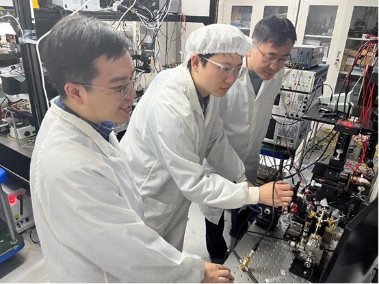 图3 王兴军教授(右)和舒浩文研究员(左)指导文章一作陶子涵(中)搭建无线通信实验