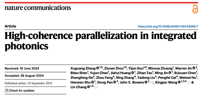 2024年9月10日,中心团队与电子学院常林研究员团队合作,在Nature Communications杂志在线发表了研究文章“High-coherence parallelization in integrated photonics”。该研究展示了一种新型低成本、高相干的集成并行源产生方案。通过结合自注入锁定光频梳和注入锁定激光器阵列,实现了在近零噪声系数下创纪录的片上60 dB增益。此外,通过将这一技术与硅光相干模块结合,实现了超过60 Tbit/s的总数据传输速率,并将相位相关的数字信号处理(DSP)开销降低了99.99999%。这项研究为实现大规模、高性能、大容量的相干光系统铺平了道路,有望解决由于流量需求爆炸式增长带来的芯片间和数据中心间互联问题,为未来光通信网络的发展带来了新的希望。
