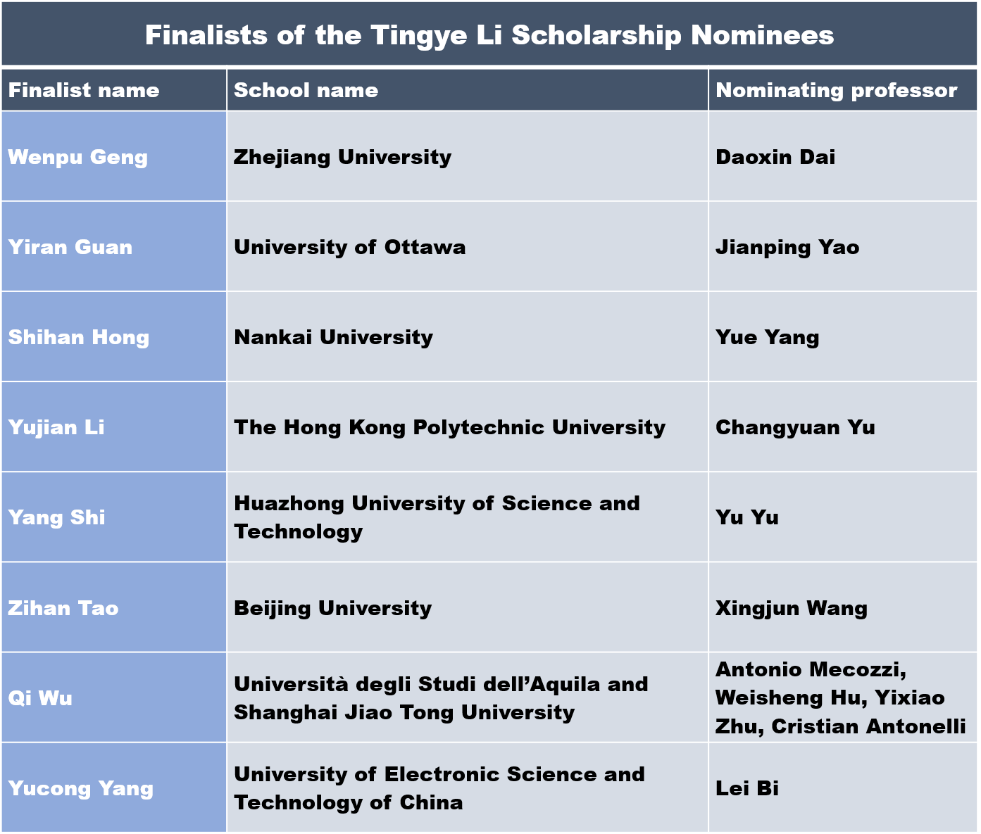 由全球顶级光子学相关项目特邀教授提名的十人入围名单被提交给奖学金评选委员会,最终由委员会根据他们的学术成就(70%)和光电子社区自愿服务得分(30%)选出获奖者。中心博士研究生陶子涵入围“厉鼎毅纪念奖学金”。