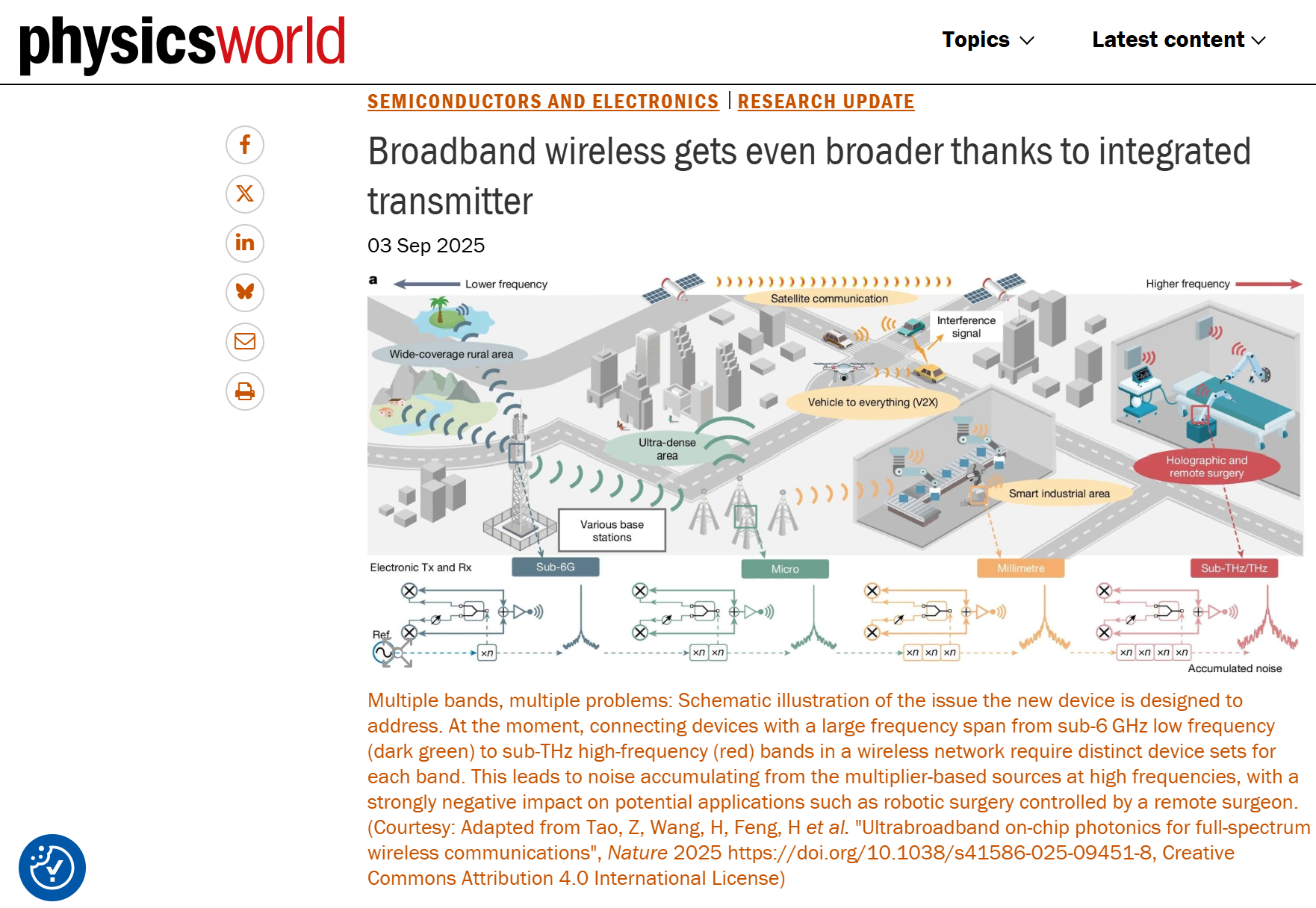 2025年9月3日,国际物理学权威媒体《PhysicsWorld》以《Broadband wireless gets even broader thanks to integrated transmitter》为题,长篇报道了我中心在超宽带无线通信系统上取得的最新研究成果。