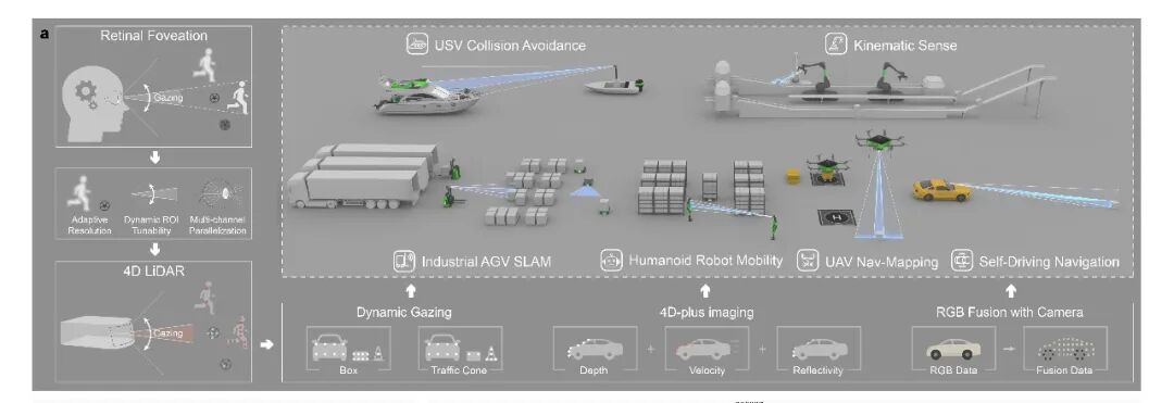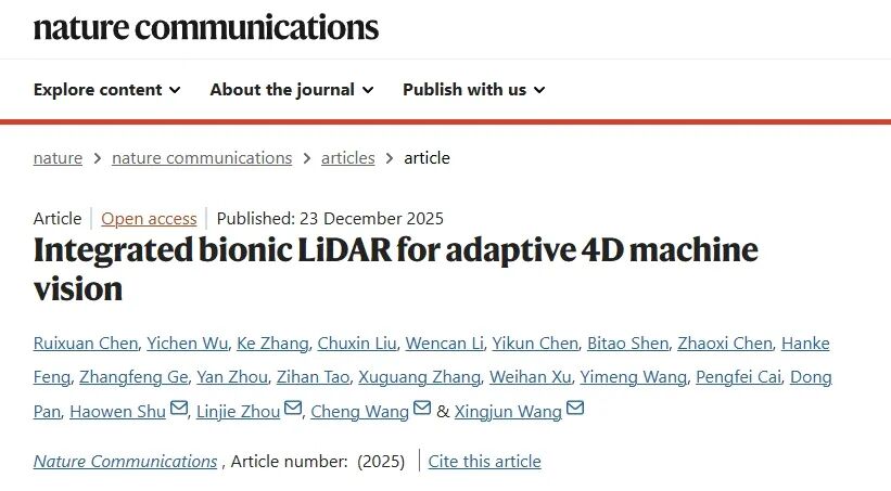 12月23日,中心的王兴军教授-舒浩文研究员团队、香港城市大学王骋教授团队及上海交通大学周林杰教授团队在Nature Communications期刊在线发表题为 “Integrated bionic LiDAR for adaptive 4D machine vision”的研究论文。研究团队提出并验证了一种受人眼视觉机制启发的集成仿生FMCW激光雷达新架构,首次在芯片尺度上实现具备“凝视”能力的自适应并行4D成像系统,并进一步通过与相机协同感知实现4D-plus机器视觉表达,为“高分辨率、低功耗、高灵活性”的下一代智能感知提供了新的路径。