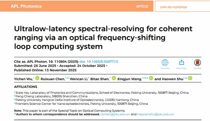 近期,中心的王兴军教授、舒浩文研究员的团队在光学计算与传感融合领域取得重要进展,研究成果以“Ultralow-latency spectral-resolving for coherent ranging via an optical frequency-shifting loop computing system”为题,发表于《APL Photonics》期刊。该研究首次将光学频移环(FSL)驱动的光学傅里叶变换(OFT)系统与调频连续波(FMCW)激光雷达深度融合,实现了纳秒级延迟的光域实时频谱分析,为自动驾驶、空间探测等高实时性场景提供了新一代光电计算解决方案。