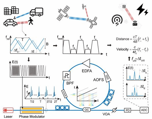 技术突破:本研究利用光学移频环路构建OFT系统,利用FSL的频率搬移和时间延迟特性,将FMCW激光雷达的混频信号频谱信息直接映射为时域脉冲序列,从而实现目标距离和速度的实时解算。通过子系统间的参数匹配优化,确保光学处理过程与激光雷达扫频周期协同,降低了计算延迟,提升了抗干扰能力。该系统在40 GHz带宽下实现15 kHz频率分辨率(对应7 mm测距精度),处理延迟降至20 ns以下,较电学FFT提升20倍,实验上验证了静态、动态测距与三维成像光学解算功能。