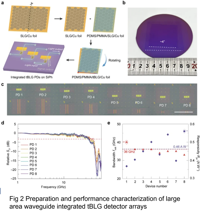 Through theoretical calculations, when the twist angle of the tBLG is 4.1°, the vHs is 0.4 eV away from the Dirac point, which is exactly half of the photon energy of 1,550 nm (0.8 eV), where the optical coupling efficiency is the highest. Combined with the design of the device structure, a high photoresponsivity of up to 0.65 A/W can be realized with a device length of only 8 μm. The average photoresponsivity of multiple devices is 0.54 A/W, which is significantly better than that of single-layer graphene and AB-stacked bilayer graphene devices. The graphene-on-silicon optical device also has a high operating bandwidth in addition to high photoresponsivity, with a 3 dB bandwidth up to 65 GHz (limited by measurement instrumentation), and shows a clear eye-diagram signal in an on-off keying modulation format of 50 Gbit/s. The device has a low power consumption of 0.8 pJ/bit, demonstrating the potential for applications in optical communications. In order to verify the possibility of integrating large-area tBLGs with silicon optics, a large-area waveguide-integrated tBLG photodetector array with a good uniformity performance based on graphene thin-film controllable stacked-layer transfer technique was constructed in this study, which demonstrated a high bandwidth of 36 ± 2 GHz and a high responsivity of 0.46 ± 0.07 A/W, proving that it is possible to integrate tBLGs on a large scale and prepare high-performance optical communication devices. It demonstrates the possibility of large-scale integration of tBLGs and preparation of high-performance optical communication devices.