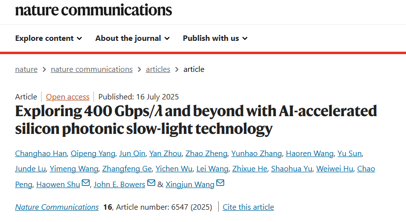 Recently, a joint team led by Professor Wang Xingjun and Research Fellow Shu Haowen from the Center, together with Academician John E. Bowers from the University of California, Santa Barbara (UCSB), has made a breakthrough in ultra-high-speed optical interconnects. They achieved, for the first time on a standard silicon photonics platform, an ultra-high-speed multi-channel signal transmission experiment at 400 Gbps per wavelength. The proposed AI-accelerated silicon slow-light modulation technology, based on a high-bandwidth all-silicon slow-light modulator chip and driven by an AI equalizer specifically designed for the nonlinear distortion of the silicon slow-light platform, significantly increased the single-wavelength transmission rate on a standard silicon photonics platform. This marks the world's first achievement of 400 Gbps per wavelength on a silicon-based platform and holds significant importance for the development of next-generation computing centers. On July 16th, the related research findings were published online in the Nature sub-journal Nature Communications under the title "Exploring 400 Gbps/λ and beyond with AI-accelerated silicon photonic slow-light technology".