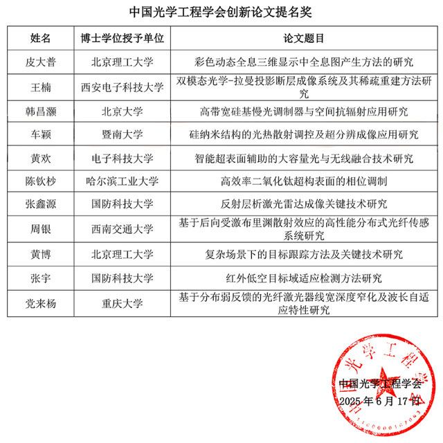On June 17, the selection results of the 10th "Chinese Society for Optical Engineering (CSOE) Innovative Paper Award" were officially announced. The doctoral dissertation of Han Changhao, a recent graduate from our center, titled "Research on High-Bandwidth Silicon-Based Slow Light Modulators and Space Radiation-Resistant Applications", was honored with the "Innovative Paper Nomination Award." The thesis was completed under the supervision of Professor Wang Xingjun from our center.